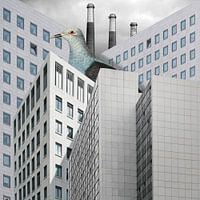 Collage van diverse afbeeldingen, met in de hoofdrol een vogel zo groot als flatgebouwen!