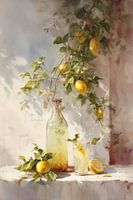 Een stilleven waarin citroentakken met helgele vruchten sierlijk rond een glazen fles met lichtgele drank hangen. Het spel van licht en schaduw op de witte ondergrond, gecombineerd met de zachte pasteltinten in de achtergrond, creëert een tijdloze mediterrane sfeer die doet denken aan een warme zomerdag.