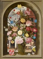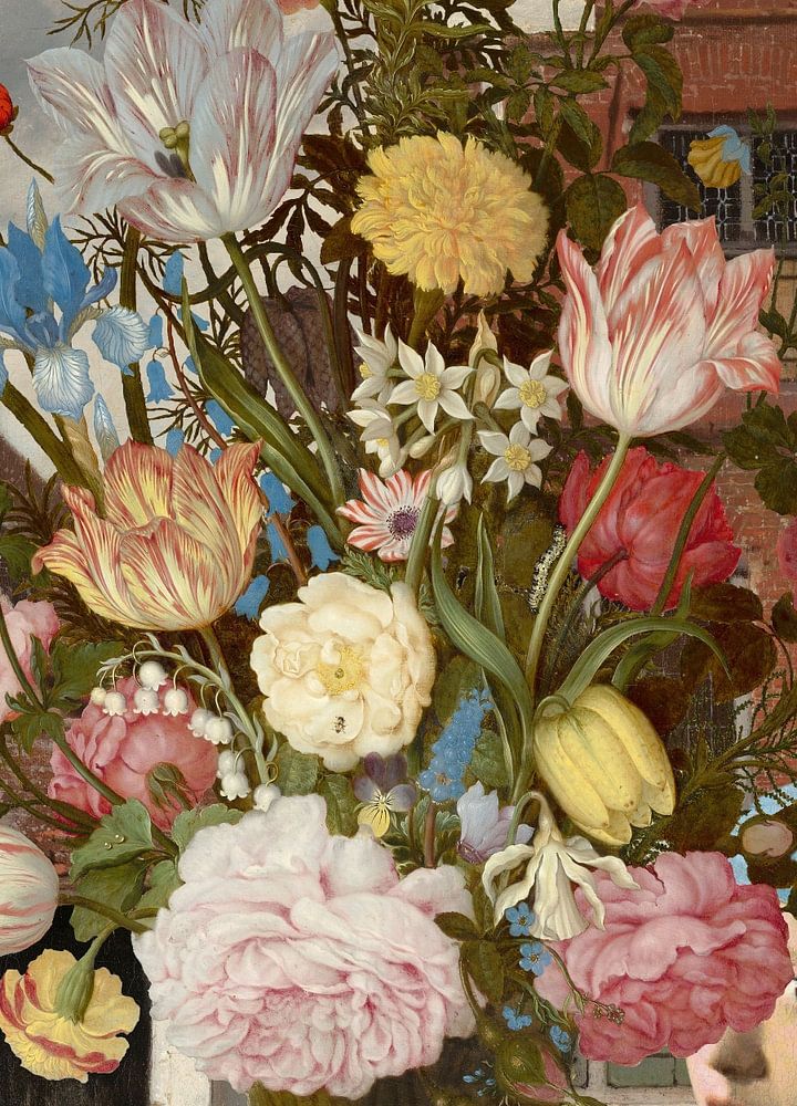 Collage van fragmenten uit schilderijen van 3 oude meesters: “Vaas met Bloemen”, in 1618 geschilderd door de Vlaamse kunstschilder Ambrosius Bosschaert de Oude, met een doorkijkje naar “Straatje van Vermeer, het beroemde schilderij uit ca. 1658 van de Nederlandse kunstschilder Johannes Vermeer. En als u goed kijkt, ziet u ook het meisje met de Parel (Johannes Vermeer, ca. 1665) naar binnen gluren. Alles bij elkaar een vrolijk en fleurig tafereel waar u steeds weer nieuwe dingen in zult ontdekken.