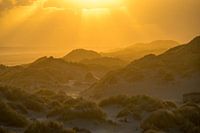 Een betoverend laagjeslandschap van de duinen aan zee, gevangen in het warme goudgele zonlicht op het strand van Terschelling. De dramatische lucht die opent boven de horizon creëert een bijna surrealistisch contrast met het zachte reliëf van het duingebied. Deze foto toont de verstilde schoonheid van het Waddeneiland, waar lucht, zand…