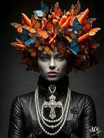 Dit digitale kunstwerk van mij, kunstenaar René van den Berg, toont een vrouwelijk portret waarin kwetsbaarheid en kracht samenkomen. Het gezicht is sereen en bijna porseleinachtig, met een directe, stille blik die de kijker vasthoudt. Haar hoofdtooi bestaat uit een uitbundige compositie van wortels en vlinders, waarin natuur en…