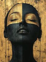 Een intrigerend schilderij toont een vrouwengezicht dat deels verdwijnt in gouden en zwarte drip-effecten. De verf druipt als tranen of regendruppels over haar serene gelaat, wat een gevoel van mysterie en kracht oproept. Het contrast tussen het glanzende goud en diep zwart versterkt de dramatische, bijna droomachtige uitstraling.
