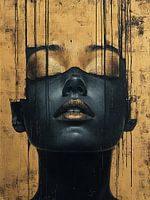 Een intrigerend schilderij toont een vrouwengezicht dat deels verdwijnt in gouden en zwarte drip-effecten. De verf druipt als tranen of regendruppels over haar serene gelaat, wat een gevoel van mysterie en kracht oproept. Het contrast tussen het glanzende goud en diep zwart versterkt de dramatische, bijna droomachtige uitstraling.