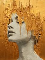 Een elegant schilderij toont een vrouwengezicht, subtiel omlijst door druppelende goud tinten. De verf vloeit sierlijk omlaag, als vloeibare lichtstralen die haar zachte gelaat accentueren. Het spel van glans en transparantie creëert een dromerige, almost hemelse sfeer. Haar blik straalt rust, mysterie en verfijnde kracht uit.