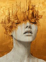 Een elegant schilderij toont een vrouwengezicht, subtiel omlijst door druppelende goud tinten. De verf vloeit sierlijk omlaag, als vloeibare lichtstralen die haar zachte gelaat accentueren. Het spel van glans en transparantie creëert een dromerige, almost hemelse sfeer. Haar blik straalt rust, mysterie en verfijnde kracht uit.