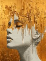 Een elegant schilderij toont een vrouwengezicht, subtiel omlijst door druppelende goud tinten. De verf vloeit sierlijk omlaag, als vloeibare lichtstralen die haar zachte gelaat accentueren. Het spel van glans en transparantie creëert een dromerige, almost hemelse sfeer. Haar blik straalt rust, mysterie en verfijnde kracht uit.