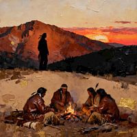 Onder een levendige, vervagende zonsondergang verzamelen vier Indianen zich rustig rond een gloeiend kampvuur, waarvan het warme licht flikkert tegen de uitgestrekte avondhemel. Vlakbij staat een eenzame figuur op een glooiende helling, afgetekend tegen amberkleurige, karmozijnrode en indigoblauwe strepen, uitkijkend over het land…