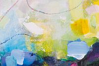 Abstracte schildering waarbij koel blauw en warm geel een natuurlijk contrast vormen. De gelaagdheid en licht-donker contrasten doen denken aan een landschap, maar laat je oog zelf ontdekken wat het wil zien.