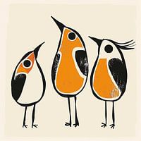 Whimsical Bird Gathering - Dit vogel schilderij toont drie gestileerde vogelfiguren met opvallende oranje en zwarte kleurvlakken tegen een neutrale achtergrond, waarbij de grafische kwaliteit en het scherpe contrast de kunst een levendige en moderne uitstraling geven.