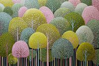Whimsical Forest Dreamscape - Dit abstract schilderij toont een speelse voorstelling van kleurrijke bomen met vrolijke ronde vormen en vrolijke stippen, die variëren in tinten van groen, geel en roze, perfect voor een modern interieur.