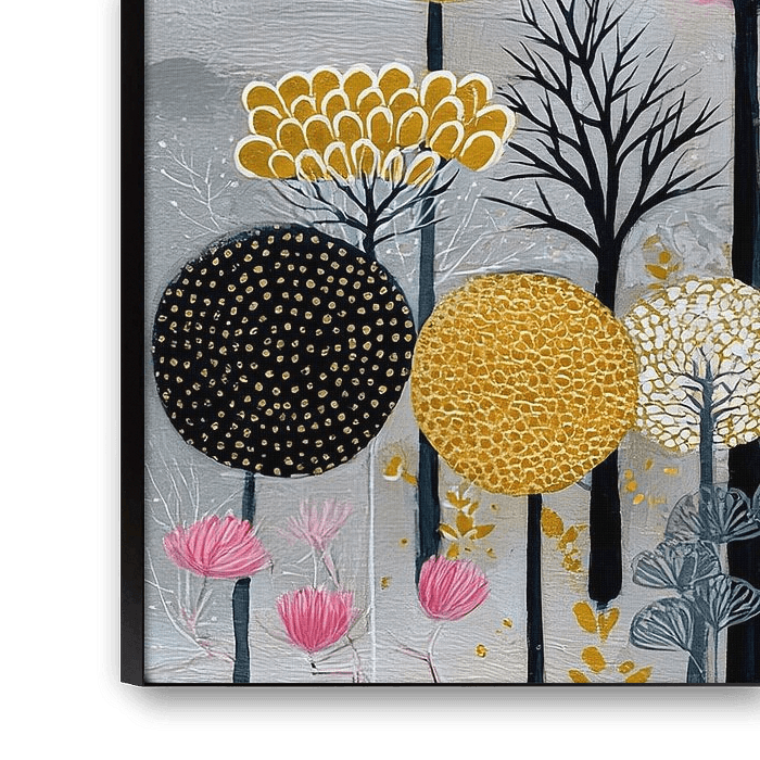 Whimsical Nature in Gold - Dit kleurrijke schilderij toont een sprankelende boomlandschap met gouden, roze en zwarte cirkels die de bomen representeren, en een speelse mix van bladeren en bloemen die een gevoel van vreugde en leven oproepen.