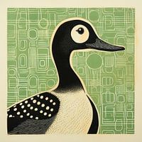 Een eend draait van dichtbij in profiel terwijl een zachtgroen veld een raster van afgeronde rechthoeken en lijnen draagt als een herinnering uit het midden van de eeuw. Het heldere oog en de bleke wang trekken eerst de aandacht; daarna onthullen de geëtste lijnen langs de nek en schouder een rustige textuur. Gedurfde vlekken op de vleugel echoën de achtergrondvormen zodat figuur en grond verbonden voelen zonder rommel. Het silhouet blijft helder en in balans, waardoor het stuk direct opvalt van de andere kant van de kamer en van dichtbij de moeite waard blijft.