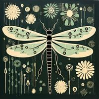 Een libel zweeft tegen een diepgroene nacht waarin hoge bloemstelen als regen opstijgen en bleke bloemen rond de vleugels gloeien. Het lichaam is getekend met duidelijke segmenten en de vleugels hebben zachte kleurverlopen bezaaid met kleine vlekjes, zodat de vorm delicaat en toch gedecideerd aanvoelt. Cirkels en bloemblaadjes herhalen zich op de achtergrond om het oog te leiden zonder de compositie te verdringen. Het contrast tussen de lichte vleugels en het donkere veld zorgt ervoor dat het beeld op afstand krachtig overkomt, terwijl van dichtbij ringen, kruizen en kleine texturen te zien zijn die een handgemaakt karakter toevoegen.