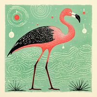 Een flamingo pauzeert in zijaanzicht terwijl de achtergrond zich opent in een veld van rustige rimpelingen. De snavel kromt zich in een scherpe S en een klein lichtpuntje in het oog brengt het gezicht tot leven. Langs de rug en vleugel geven korte gegraveerde lijnen en zachte arceringen vorm aan de veren zodat de vorm tastbaar blijft…