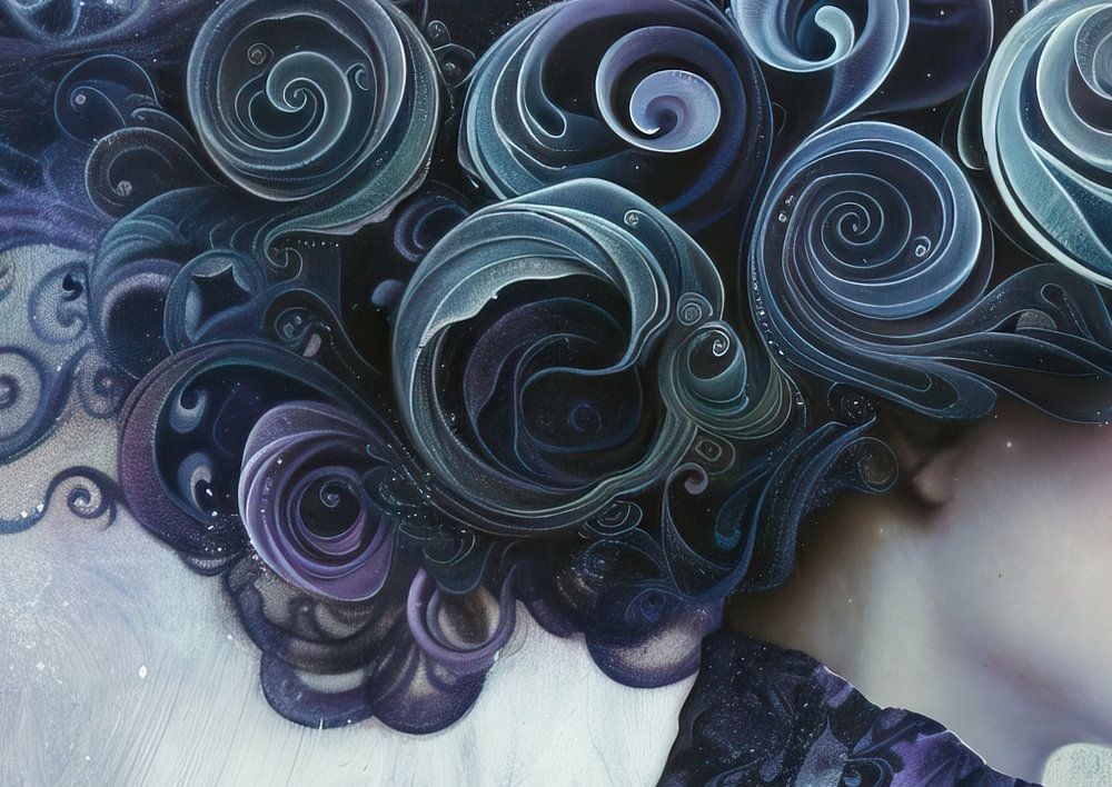 Whirls of Serenity - Dit vrouwen schilderij toont een fijne afbeelding van een zijkantprofiel van een vrouw met een verstrengelend, sierlijk ontwerp van spiralen en vormen die samen een uitbundig en dromerig kapsel vormen, uitgevoerd in overwegend koele blauwe en grijze tinten met subtiele violette accenten, die haar nobele en mysterieuze uitstraling versterken.