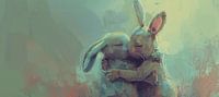 Details: konijnen, knuffel, tederheid, liefde, abstract, blauw, geel, groen, bruin