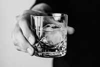 Een meesterlijk vormgegeven glas gevuld met heldere vloeistof glinstert in het zachte licht. Een perfect gevormd ijsblokje glinstert erin en verleidt de zintuigen met beloften van verfrissing en plezier. De hand die het glas vasthoudt straalt een elegante uitnodiging uit - een moment van ontspanning, gevangen in een tijdloze zwart-wit…