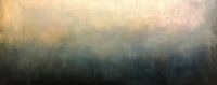 Whisper of Morning Haze - Dit abstracte schilderij kenmerkt zich door een gradient van een dominante nevelige blauwgroene tint die overgaat in gouden en beige hoogtepunten aan de randen wat een diepte en mysterie creëert alsof je in een dichte, vroege ochtendmist kijkt.