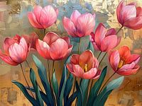 Details: tulpen, roze tulpen, bloemenschilderij, bloemen kunstwerk, gouden details, lente bloemen, natuurlijke schoonheid, moderne kunst, interieurdecoratie, galerij…