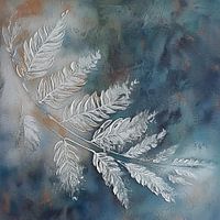 Etherische weergave van fijne bladeren, zorgvuldig geplaatst tegen een achtergrond met een complexe textuur. De kleuren variëren van koele grijze en blauwe tinten tot warmere aardse kleuren, die samen een rustig en bedachtzaam palet vormen. De gedetailleerde en sierlijke lijnen van de veren contrasteren met de abstracte en bijna stormachtige achtergrond, wat zorgt voor een intrigerend spel tussen orde en chaos.