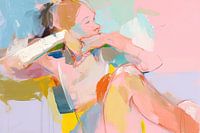 Whispered Hues - Dit abstracte schilderij met een levendige compositie van penseelstreken en kleurvlakken, waarin een vervaagde impressie van een persoon zichtbaar is, samensmeltend met de achtergrond in een harmonie van pasteltinten.
