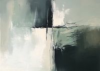 Whispered Secrets in Grey - Dit abstracte schilderij toont een meditatieve vermenging van zachte grijze en groene tinten, onderbroken door een krachtige zwarte verticale lijn die dynamiek en contrast toevoegt.