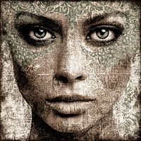 Een close-up van een gezicht dat lijkt opgebouwd uit lagen tekst en patronen. De ogen zijn krachtig en doordringend, alsof ze een geheim bewaren. Het werk voelt mysterieus en tijdloos, alsof geschiedenis in de huid is geëtst.