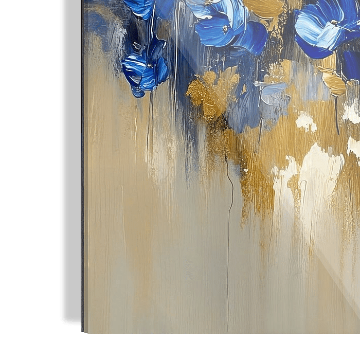 Details: bloemen, blauw, goud, beige, impasto, textuur, dynamisch, levendig, kunst,…