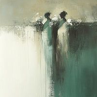 Whispering Colors Merge - Dit abstracte schilderij toont de versmelting van twee menselijke figuren omgeven door een atmosferisch veld van groen en crème tinten, wat een gevoel van mysterie en eenheid oproept.