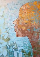Whispering Colors - Dit abstracte menselijke profiel schilderij, gekenmerkt door een mix van roestbruine en zachte blauwe lagen, toont een dynamische textuur met zichtbare graffiti-elementen en losse bladvormen.