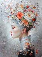 Whispering Flowers of Grace - Dit vrouwen schilderij toont een serene vrouwelijke figuur met een uitbundige kroon van realistische en delicate bloemen in diverse kleuren; de achtergrond kenmerkt zich door subtiele zilvergrijze tonen met fijn verweven florale patronen.
