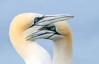 Klassieke liefdeshouding van twee jan-van-genten op Bass Rock in de Firth of Forth een paar mijl buiten de oostkust van Schotland nabij North Berwick.