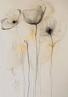 Whispering Poppies - Dit bloemen schilderij toont drie abstracte, elegant lange papavers met grote, zacht uitziende bloemhoofden, uitgebeeld in gewassen tinten van grijs en zwarte inkt, met subtiele accenten van goud.