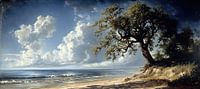 Whispering Tides - Dit kust schilderij toont een idyllische en serene kustlijn, verrijkt met een majestueuze boom die kracht en rust uitstraalt, terwijl de zee zachtjes het zand raakt. Dit schilderij is een ode aan de natuurlijke schoonheid van de kust.