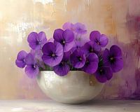 Whispering Violet Embrace - Levendige paarse bloemen in een minimalistische witte vaas op een pastelkleurige achtergrond
