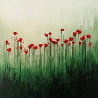abstractie met natuurlijke motieven en creëren een mooie balans tussen minimalisme en emotionele expressie. Krachtige penseelstreken vormen lange, dunne stelen met rode klaprozen die van het doek afspatten. De bloemen lijken te zweven op een achtergrond die verloopt van zacht crème naar diepe groentinten, als een veld dat in nevel…