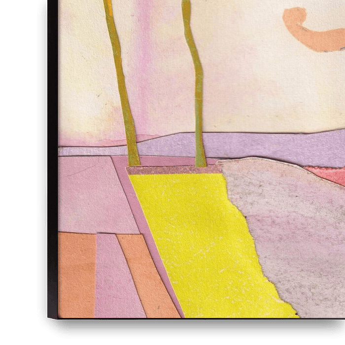 Deze collage vangt een dromerig landschap in zachte pasteltinten, die een poëtische wereld scheppen. De twee slanke bomen aan de linkerkant geven het werk een subtiel ankerpunt, terwijl de zwevende, zaden in de lucht een gevoel van lichtheid en beweging oproepen. De warme kleuren creëren een sfeer van rust, zachtheid en optimisme. Het…