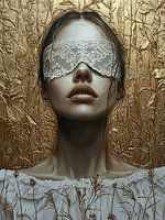 Een intrigerend schilderij toont een vrouwengezicht dat deels verdwijnt in goud en wit effecten. Haar serene gelaat gaat deels schuil achter een wit kanten masker, wat een gevoel van mysterie en kracht oproept.