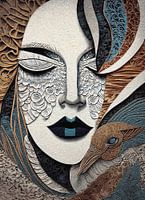 Een vrouw met haar ogen gesloten straalt innerlijke vrede uit, alsof ze de nieuwste slaapmode heeft ontdekt: ogen dicht, zorgen weg! Een vredesvogel vlijt zich tegen haar wang, alsof hij stiekem een dutje doet op een kussen van harmonie. En kijk eens goed: dat vleugje blauw is niet zomaar wat kleur, het is de magie van blauwe M&M's die je een vrolijke knipoog geeft!