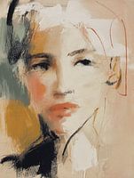 Een ingetogen portret dat met losse penseelstreken en zachte kleurovergangen een gevoel van kwetsbaarheid en mysterie oproept. De blik van de vrouw is licht neergeslagen, alsof ze in gedachten verzonken is. Warme aardetinten en koele grijstinten wisselen elkaar af, waardoor een harmonisch, bijna dromerig beeld ontstaat dat uitnodigt tot langer kijken.