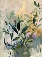 Whispers of Nature's Peace - Dit planten schilderij vangt de essentie van serene natuur met een focus op diverse groengetinte bladeren en een enkelvoudige bloem met rood-witte tinten. De achtergrond van het schilderij is gevuld met abstracte, vloeiende vormen en een divers kleurenspel van beige, pastelblauw en gouden accenten die de ondergrond een zonsopgang-achtige allure geven. De bladeren zijn gedetailleerd uitgewerkt met verschillende tinten groen, variërend van licht tot donker, en de contouren zijn zacht en subtiel aangezet, wat een rustige en bijna dromerige sfeer geeft. Dit kunstwerk straalt een kalme en vredige atmosfeer uit en zou een liefhebber van botanische kunst zeker aanspreken. De textuur, waarneembaar door subtiele penseelstreken en spat-effecten, draagt bij aan de dynamiek en het organische karakter van het werk.
