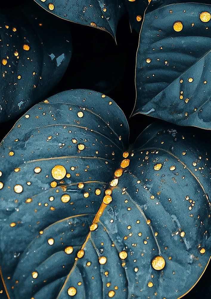 Een close-up van grote donkergroene bladeren, bedekt met subtiele gouden waterdruppels die glinsteren in het zachte licht. De achtergrond is diepzwart, wat een intense, mysterieuze sfeer creëert. Het geheel is gehuld in een moody, atmosferische setting, waarbij de filmische verlichting een dramatisch contrast biedt tussen licht en schaduw. Het kleurenpalet, met donkere tinten van blauw en grijs, versterkt het melancholische karakter van de scène. Het beeld heeft de uitstraling van een zorgvuldig met gouache geschilderd kunstwerk, dat de texturen van de bladeren en de druppels benadrukt.