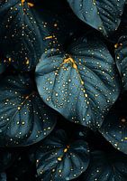 Een close-up van grote donkergroene bladeren, bedekt met subtiele gouden waterdruppels die glinsteren in het zachte licht. De achtergrond is diepzwart, wat een intense, mysterieuze sfeer creëert. Het geheel is gehuld in een moody, atmosferische setting, waarbij de filmische verlichting een dramatisch contrast biedt tussen licht en…