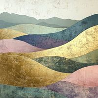 Whispers of the Valley - Dit is een abstract schilderij dat een moderne interpretatie van heuvelachtige wijnvelden visualiseert in een kleurrijke en gelaagde compositie.