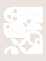 Abstracte print met een wit geometrisch patroon. De achtergrond is een wat donkerdere tint beige. Het witte geometrische patroon is opgebouwd uit diverse geometrische vormen, zoals cirkels, vierkanten, halve cirkels en variaties daarop.