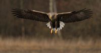 Landende White-tailed Eagle! Vleugels volledig open en landend op een open grasvlakte!