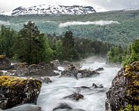 Snelstromend water tussen de rotsen. Halverwege de lente is een mooie tijd om in Noorwegen te zijn.