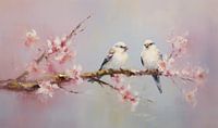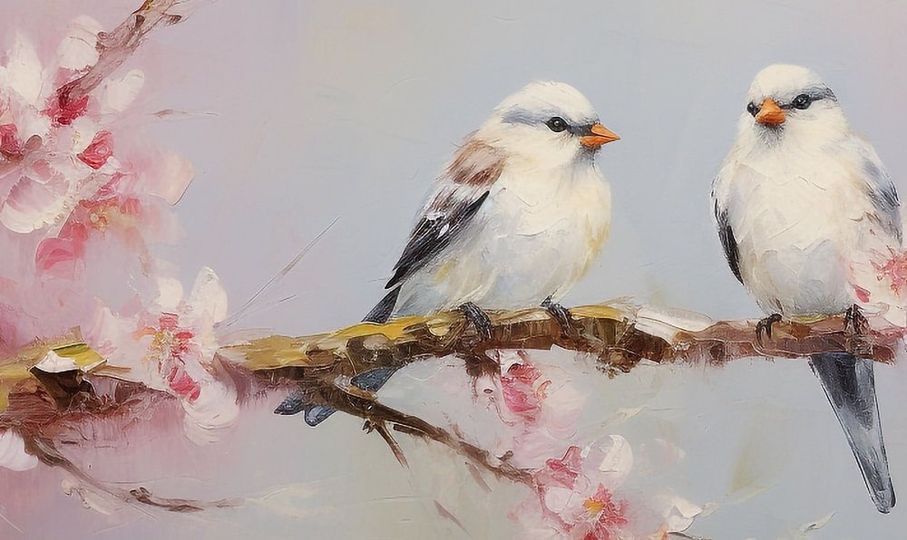 Twee prachtige witte vogeltjes op een roze kersenbloesemtak. Idyllisch en verfijnd. Eenvoud en vervaagd. Passend bij diverse stijlen en trends. Kleurstelling naturel en pastel. Sweet embrace.
