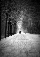 Een prachtig besneeuwde dreef in natuurdomein "De Gavers" in Harelbeke. De kale kruin van de bomen vormt een mooie boog boven het witte landschap. De zwart-wit nabewerking legt de nadruk op het tunnel-effect waardoor de aandacht volledig naar de wandelaars in de verte wordt gezogen.