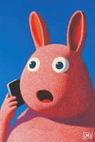 Who Dis? - Dit dierenschilderij toont een verbijsterd rood konijn dat een smartphone gebruikt tegen een strakblauwe achtergrond, waar het contrast tussen technologie en natuur onderstreept wordt.